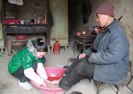 图为叶琼为养父叶章银洗脚