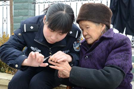 图为民警正在为唐良青老人修剪指甲。 (汪莹 摄)