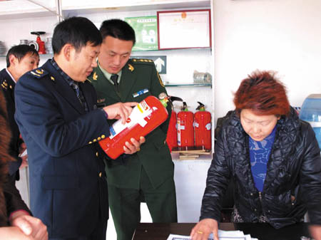 “3·15”消费者权益保护日到来前夕,县质监局、消防中队、工商局深入城区3家消防器材经销店,重点对干粉灭火器、消防水带、消防栓箱、应急照明装置等四类十一个品种进行了检查。通过此次专项检查,进一步规范了消防器材市场,确保全县消防器材产品的质量安全。 (李俊伟 摄)