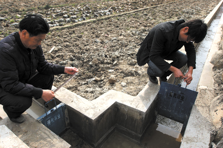 3月27日,水利施工专业队伍正在防渗处理白鹤镇王家沟“最后一公里”渠道。据了解,灌区末级及渠系不能配套等引起的农田灌溉“最后一公里”问题,严重制约了全县粮食增产,近两年来,我县投资3000多万元,打通“最后一公里”渠道和进田“毛细血管”,新修高效节水渠道312.3公里,配套节水设施275处。图为水利技术员在验收田间节水设施。 (张启龙 摄)