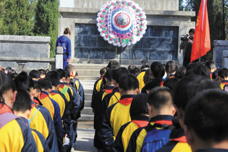 在纪念碑前,全体师生了解了烈士们保家卫国的英雄事迹,并敬献了花圈。 (吴勇 摄)