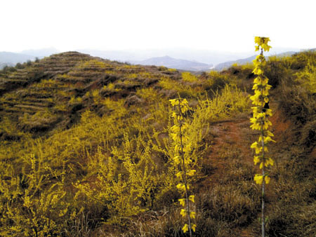 日前,笔者在化龙堰镇西街村连翘示范基地看到,成片的低岗山丘上布满了金黄的连翘花。据悉,该镇于2009年开始建设连翘规模化栽植示范基地,种植面积已达6000亩。明年进入丰产期后,年亩产连翘茶50公斤,亩产连翘籽150公斤,可实现产值1800万元。 (刘林 刘道运 摄)