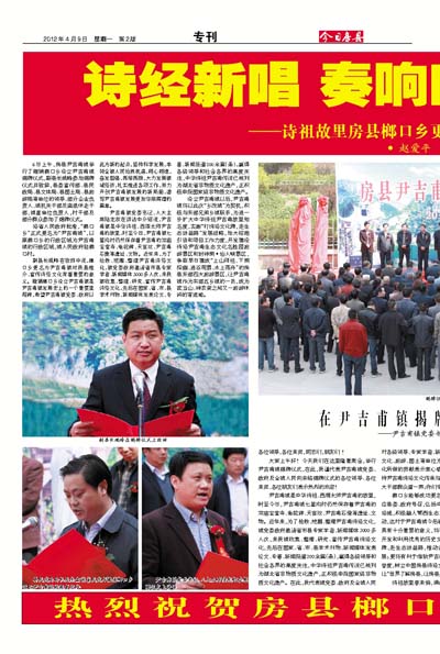 尹吉甫镇党委书记、人大主席陆龙权在讲话中介绍说,尹吉甫镇是中华诗祖、西周太师尹吉甫的故里,时至今日,尹吉甫镇七星沟村仍然保存着尹吉甫的宗庙宝堂寺、龟驼碑、天官坟、尹吉甫石像等遗址、文物。近年来,为了抢救、挖掘、整理尹吉甫诗经文化,镇党委政府邀请省市县专家学者、新闻媒体3000多人次,来我镇收集、整理、研究、宣传尹吉甫诗经文化,先后在国家、省、市、县学术刊物、新闻媒体发表论文、专著、新闻报道200余篇(条),赢得各级领导和社会各界的高度关注,中华诗祖尹吉甫传说已被列为湖北省非物质文化遗产,正积极申报国家级非物质文化遗产。