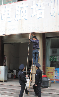 截至目前,县住建局已组织40多名干部职工分别对房陵大道、武当路等城市主干道进行了环境综合治理。图为县城管局工作人员正在房陵大道拆卸破旧广告牌。
