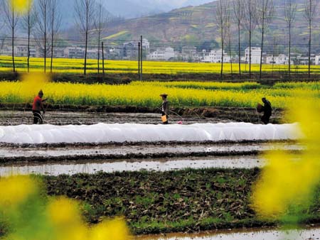 清明过后,房陵大地油菜花黄,犁耙水响,随处都能看到农民群众抢抓有利时机忙春耕的景象。图为化龙堰镇长望村农民正在下种育秧。 (陈竹 丁娟 摄)