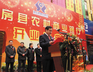 图为农商银行董事长彭刚在开业仪式上讲话