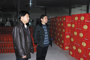 董事长彭刚(右)在兴祥黄酒了解企业生产情况