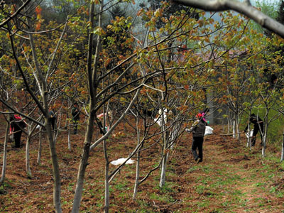 11日,门古寺镇彭家湾村果农们在县林业局技术人员的指导下对核桃树进行修枝、除草、追肥、施药。近年来,该镇紧紧围绕县委、县政府提出的打造“百万亩核桃基地”的目标,积极引导群众发展核桃产业,全镇建设核桃基地3万亩。自2月中旬以来,该镇组织果农抢抓有利时节对核桃进行田间管理,目前已完成1.8万亩。 (樊行波 张兴成 摄)