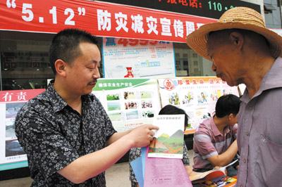 10日,我县5·12防灾减灾大型宣传咨询活动在寿康生活广场举行。活动中,县应急办、县水务局、农业局、民政局、地震局、气象局、国土局、林业局等18家单位,通过悬挂条幅、设立咨询台、现场解答、发放宣传画册和宣传单、摆放展板等方式,向市民宣传介绍防灾减灾知识,提高广大市民防灾减灾的意识。图为县防汛抗旱办公室工作人员正在向群众讲解山洪地质灾害防御知识。