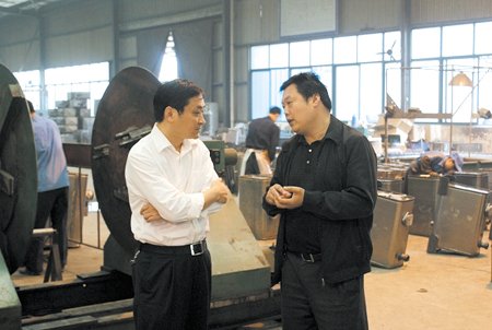 县农商行董事长彭刚(左)在企业了解生产情况