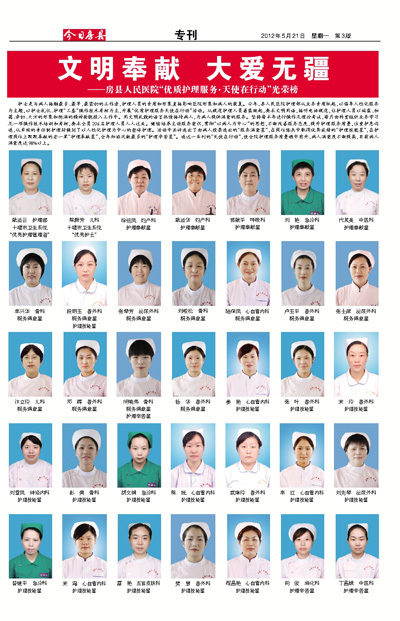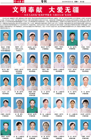 护士是与病人接触最多、最早,最密切的工作者,护理人员的素质和形象直接影响医院形象和病人的康复。今年,县人民医院护理部从业务素质抓起,以倡导人性化服务为主题,以护士礼仪、护理“三基”操作技术考核为主,开展“优质护理服务天使在行动”活动。从规范护理人员着装做起,要求文明用语,接听电话规范,让护理人员以端装、和蔼、亲切、大方的形象和饱满的精神面貌投入工作中。用文明礼貌的语言热情接待病人,为病人提供满意的服务。坚持每半年进行操作及理论考试,每月由科室组织业务学习及一项操作技术培训和考核,要求全员206名护理人员人人过关。继续培养主动服务意识,贯彻“以病人为中心”的思想,不断改善服务态度,提升护理服务质量,注重护患沟通,从单纯的责任制护理转换到了以人性化护理为中心的整体护理。活动中共评选出了由病人投票选出的“服务满意星”,在岗位练兵中取得优异成绩的“护理技能星”,在护理岗位上默默奉献的老一辈“护理奉献星”,全年加班次数最多的“护理辛苦星”。通过一系列的“天使在行动”,使全院护理服务质量稳中有升,病人满意度不断提高,目前病人满意度达98%以上。