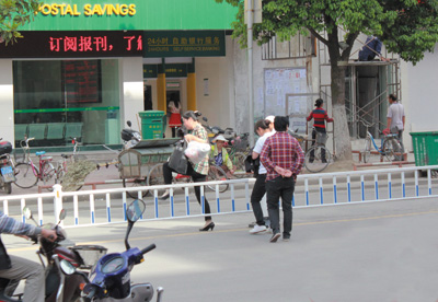 17日下午6时许,记者在城区中心路段看到,部分行人为了便捷穿过马路时常横跨隔离栏,使路过的车辆纷纷鸣笛绕过或紧急刹车,这些跨栏不文明行为时刻威胁着交通安全。本报呼吁广大市民遵守交通规则,过马路请走人行横道。图为三名行人在县寿康超市门口路段横跨道路隔离栏。 (华成 摄)