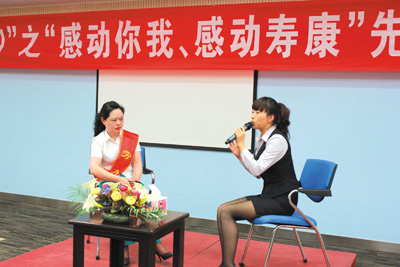17日,寿康永乐房县片区举行了“感动你我、感动寿康”先模事迹巡讲。在巡讲中,该公司房县片区全体员工学习了2011年全市寿康永乐公司优秀劳动模范的先进事迹,并纷纷表示在今后的工作中,将学习劳动模范“爱岗如家”的精神,立足岗位,身体力行,为寿康永乐公司的发展贡献出自己的一份力量。图为寿康永乐房县片区劳动模范孙文珍在现场接受访谈。 (闻燃 王丽君 摄)