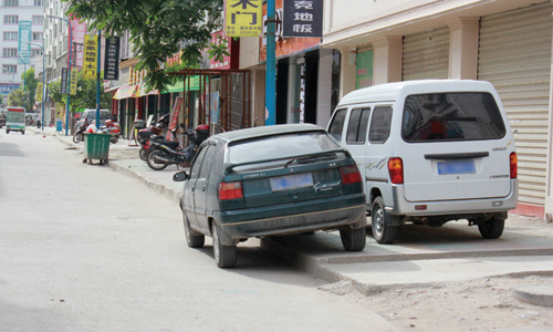 21日下午5时许,记者在城区建设路路段看到,有车主为一时方便将机动车停放在人行道上,给过往行人特别是盲人的行走带来了极大的不便。本报呼吁广大车主朋友们请将车辆停放在正确的位置,为大家营造一个安全畅通的交通环境。图为建设路上由于两辆机动车的不当停放致使人行道堵塞。 (华成 摄)