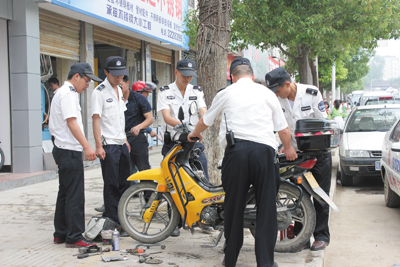 23日下午3时许,记者在武当路看到,有一家修车行在人行道上修理摩托车,为过往行人带来了极大的不便,县城市管理执法队对其迅速进行了清理。本报呼吁商家们要规范经营秩序,为大家营造一个和谐整洁的城市环境。图为县城市管理执法队正在对占道经营的行为进行清理。 (华成 摄)