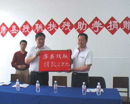 22日下午,县残联理事长散启先一行前往县特殊教育学校,看望残疾学生及特教老师,为他们送去2万元扶残助学金,并鼓励学生们珍爱生活,好好学习,自强不息。图为捐赠仪式现场。 (许旭 摄)