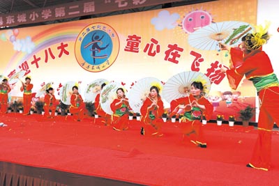 一直以来,东城小学一方面立足教学教研,努力提高整体教学成绩,另一方面,积极开展养成教育和丰富多彩的文体活动,以“快乐学习,健康成长,积极工作,幸福生活”为目标,组织全体学生开展“大家唱大家跳”活动,落实“大课间”制度,让全体学生学得扎实,玩得愉快。艺术节期间,五年级部分学生编排表演的诗经朗诵成功登上十堰大型广场诵读活动现场,四、五年级100多名学生表演的武当太极健身操比赛荣获全县小学组第一名。学校以年级为单位开展丰富多彩的艺术类活动。巧夺天工的学生手工作品,展示了孩子们聪明智慧。