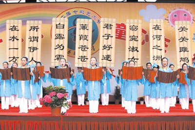 “七彩”艺术节在四年级、五年级主唱的《让诗经飞扬》、《少年,少年,祖国的春天》中拉开序幕。歌舞表演《飒爽英姿》,相声《全面发展》,情景剧《爱我你就亲亲我》《喜洋洋与灰太狼》《眼睛,心灵的窗户》展示了少年儿童快乐学习,健康成长的真实生活。文艺演出之中穿插红歌传唱,一年级的《我爱北京天安门》,二年级的《种太阳》,三年级的《共产儿童团歌》,六年级的《歌唱祖国》带动全场热情激昂。大家挥动着手中的五星红旗、向日葵等道具随着歌声尽情释放对祖国对幸福生活的热爱。教师与学生同乐,舞蹈《梦里水乡》把现场的每一个人带入了如诗如幻的奇妙境界。