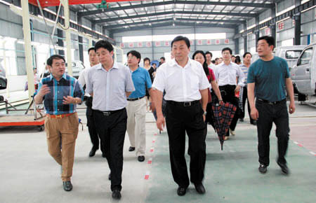 图为竹山县党政考察团在县委书记沈明云等领导陪同下参观雅德农用车生产车间