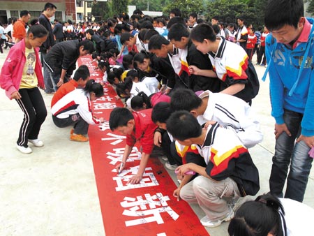 活动通过向学生讲解吸烟的危害,教育学生主动拒绝香烟诱惑,拒绝吸烟,远离烟草,珍爱健康,门古寺镇中学千名学子现场签名表示“拒吸第一支烟 做不吸烟新一代”。图为签名仪式现场。