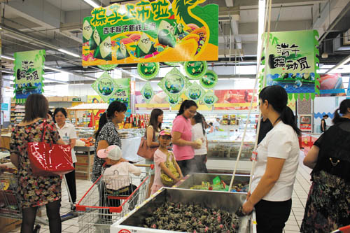 距离端午节还有一个多星期,笔者在县寿康永乐生活广场看到,清香软糯、口味多样的粽子,香甜的蜜枣却早已摆上了柜台,超市内充满了浓浓的节日气息。据了解,今年该广场除了为广大消费者提供豆沙粽、大枣粽、猪肉粽等主打产品外,还将增设板栗、葡萄干等新品种,这将大大满足消费者不同的口味需求。同时,超市内还特意配置了蒸锅,方便顾客随时购买到热乎乎的粽子,随买随吃。图为顾客们正在超市内挑选粽子。