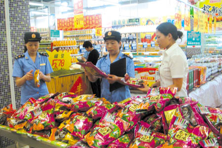 为加强端午节期间的食品安全监管工作,保障消费安全,县工商局按照夏季食品安全集中整治行动的要求,对端午节市场进行一次全面检查。图为15日,县工商局执法人员在寿康生活广场检查粽子的质量及包装标识。 (代涛 摄)