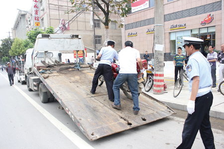 21日上午9时,记者在东城门路看到部分摩托车车主将车违章停放在机动车道上,使来往车辆不得不紧急变道通行,严重影响了交通秩序。本报呼吁广大车主请遵守交通规则,将摩托车、自行车停放在人行道上指定区域,为市民创造和谐有序的生活环境。图为交警执法人员在中百仓储门前将违章停放的摩托车推上拖车。 (华辰 摄)