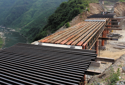 自4月1日六里峡电站引水渡槽拆除与复建动工以来,谷竹高速公路建设指挥部不断优化设计方案,坚持高标准、高起点、高要求的施工理念,完成了渡槽贝雷梁架设。图为六里峡渡槽施工现场。 (代启和 摄)