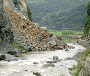 7月10日,因暴雨导致大木厂镇土地岭河道发生滑坡,整个滑坡长近40米,高7米、预计土石方近2500方,发生滑坡后使原来近20米宽的河道仅剩不到3米,如遇洪涝灾害,将严重影响到集镇和周边的1000多亩农田安全。 (吴勇星 摄)