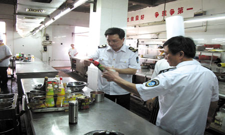 10日下午,县卫生监督人员正在对霖泓大酒店餐饮工作进行检查。为认真搞好“三城联创”工作 ,连日来,县爱卫办组织卫生监督人员先后深入城区3家星级宾馆、6家规模酒店检查餐饮业“量化分级管理”与相关制度落实情况,并对检查过程中发现的问题提出整改意见。