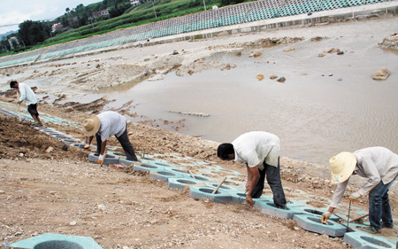 13日,军店镇集镇河道治理工程中工人们正在铺设护坡砖。去年5月以来,军店镇抢抓竹房城镇带建设机遇,计划治理河道3900米,工程总投资3000万元。其中一期工程1200米,投资1700万元;二期工程新修生态河堤2700米,投资1300万元。目前,一期工程已经全面竣工,二期工程正紧张有序推进,年内将全面完工。 (赵爱平 刘玲玲 摄)