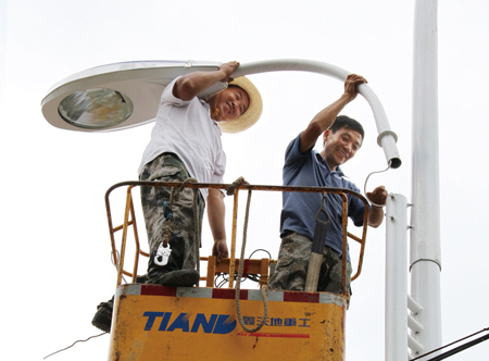 16日,县路灯安装管理所工人正在房陵大道西延工程安装路灯。自5月20 日以来,县路灯安装管理所干部职工抢睛天、冒雨天,战高温,积极为房陵大道西延工程安装路灯。经过一个多月的奋战,目前,已安装路灯200余套,60%的路灯已投入使用。预计路灯安装路灯安装将于8月初结束。 (赵爱平 罗德虎 摄)