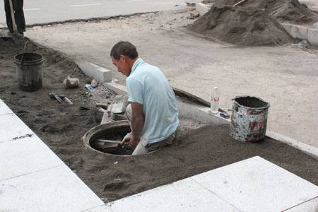 近日,记者在神农路看到施工人员正在忙着铺装人行道板。