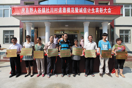 7月30日,野人谷镇杜川村召开群众大会,对10对好婆媳、10名好儿女、10户好邻居、10对好夫妻、10户诚信计生户以及59户“十好文明农户”进行了奖励和表彰。为创建合格的文明新村,今年以来,杜川村道德协会配合结对共建单位县旅游局和野人谷镇财政所开展了打造文明新村创建活动。通过开展此项活动,杜川村文明氛围浓厚,社会风尚良好,居住环境得到了改善,促进了村级经济发展。