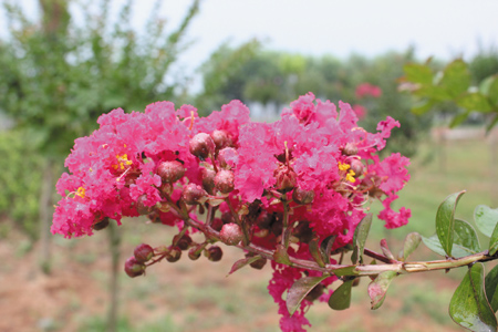 记者从县城建局了解到,北门河桥头迎宾公园于今年3月底开始组织施工,5月上旬竣工投入使用。共回填砂石料13300立方米,土方10160立方米;安装路沿石310米,休息石条櫈12个,庭院景观灯18套;铺装人行道780平方米、通道750平方米、小广场80平方米;栽植胸径20厘米香樟行道树39棵、桩景树4棵,绿化树木1050棵、绿化苗木8200株,种植草皮12700平方米。图为迎宾公园内盛开的紫薇花。 (亦文 摄)
