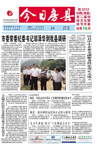 市委常委纪委书记邬泽华到我县调研房县中小企业金融服务俱乐部正式成立全县城乡居民社会养老保险全覆盖工作会议召开杜启学要求要进一步提高社区矫正工作制度化规范化水平我县一批垃圾转运设备正式投入使用县卫生系统“创卫”工作推进会召开