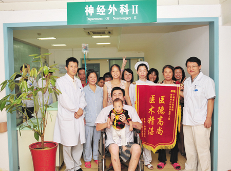 襄樊人余某,今年33岁,是家中的顶梁柱。1个月前,余某来十堰探亲,走在大街上,一辆卡车疾驰而过,将他撞伤在地。余某当即昏迷不醒,路人立刻将他送往市人民医院神经外科Ⅱ病区。接到病人后,赵斌杰、王林涛教授迅速给予紧急处理,保住余某的性命。