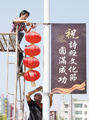 9月6日,滨湖大酒店的工作人员正在房陵大道上悬挂红灯笼和彩旗。为与会嘉宾和市民营造一个良好生活环境,目前,房县诗经文化旅游节组委会已组织相关单位正在悬挂3000个大红灯笼、彩旗200面,摆放40000盆时令鲜花,在重要节点悬挂82个氢气球,为诗经文化旅游节营造热烈、隆重、大气的节日氛围。