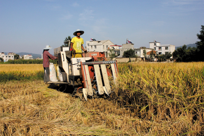 5日,记者在城关镇白土村看到金黄色的稻谷粒粒饱满,一派喜人的丰收景象,几台收割机正繁忙作业。据了解,我县自实施国家农机补贴以来,大大提高了广大农户购买农机具的积极性。目前,适宜农机收割面积10万亩,全县有收割机60余台,基本满足收割需要。 (陈锐 常和军 摄)