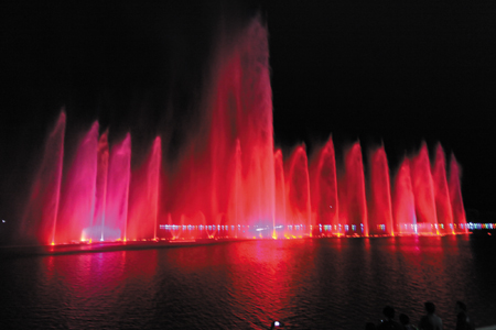 三道河音乐喷泉工程主要内容包括激光水幕电影和音乐喷泉,此项工程的设计理念以虚实隐显的多变艺术形式构成。水幕喷泉主体水景共有擎天玉柱、高歌猛进、盛世奇葩、群峰峥嵘、龙行天下、风拂杨柳、铿锵礼炮、光明万丈、莲花绽放、出水芙蓉、蒸蒸日上、凤凰高飞、水天一色、红红火火、百变莲花、激光16个,主体景观达到了气势宏伟的效果,律动、光晕的变幻,音乐的空灵能够充分表现出房县的历史文化内涵。 (赵爱平 吴宏强 何琼 摄)