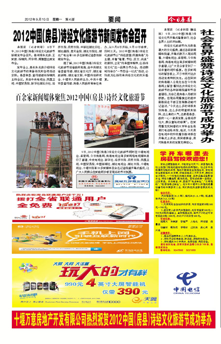 9日,2012中国(房县)诗经文化旅游节同时在十堰电视台、秦楚网、今日房县网、房县电视台等多家网络电视媒体进行了直播,中央电视台、新华社、经济日报、农民日报、凤凰卫视、中国贸易报、中国新闻社、湖北电视台、湖北日报、十堰电视台、十堰日报等20多家媒体百余名记者报道开幕式盛况,让广大人民群众在家能同步感受现场的节日氛围。