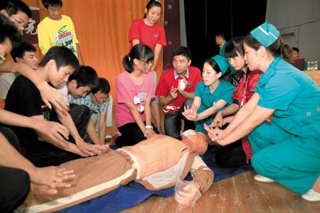 8日,由湖北医药学院实践团队和县人民医院急诊科联合推广的“急救知识进校园”活动在县一中举行。活动中,来自县人民医院急诊科的医护人员,现场向该校900余名高一新生讲授有关意外情况下的心肺复苏、外伤止血包扎、如何保证个人卫生等知识;利用现场演示、情景剧等多种形式,与学生积极互动,邀请新生现场演练。活动的开展,使学生们学习了必要的急救知识,提高了遭遇意外伤害后自救的能力。图为医护人员与学生现场交流演示。(魏远扬 裴中东 摄)