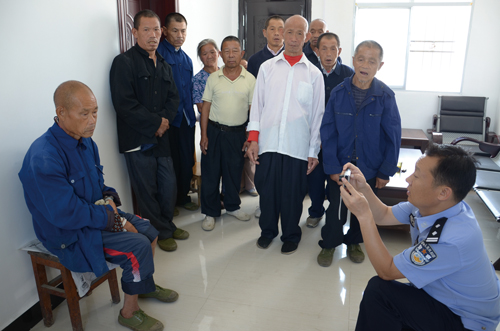 为方便残疾、孤寡老人及时领取社会养老保险,近日,县公安局城关镇派出所民警来到县社会福利院,为该院30名院民现场采集身份证照片。图为民警付伟正在给老人照相。 (魏世银 汪莹 摄)
