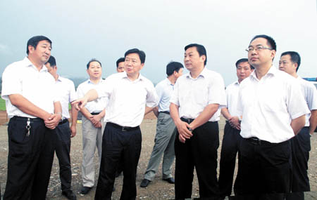 图为市委书记周霁(左二)在县委书记沈明云(右二)、县长朱光洪(右一)的陪同下视察工业园区建设。