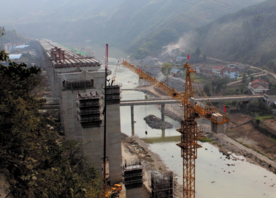 近日,随着最后一片长30米、重80吨的钢筋混凝土预制T梁被稳稳当当地架设在25#桥墩之上,谷竹高速公路关键控制性工程——青峰特大桥梁板架设成功跨越马栏河大桥。谷竹13标承建的青峰特大桥桥梁跨径34×30m,全长1031.5m,桥面宽度24m,最高桥墩达到45.5m。其中第25孔跨越马栏河桥。截至目前,青峰特大桥工程已完成桩基200根,占总数的94%,承台30个,占总数的97 %,墩柱84个,占总数的85%。按照目前施工进度,预计年底将完成全桥梁板的架设。 (张燕 摄)