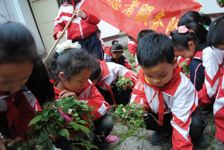 近日,城关镇天明小学组成的志愿者服务队正在街道旁边清扫杂草和垃圾。连日来,城关镇中小学6000名师生积极开展“三城联创”活动。他们利用师生承诺签名和宣誓、评选“卫生标兵”、“道德少年”和“模范教师”,使“三城联创”活动开展的有声有色。 (孙爱华 王群华 摄)