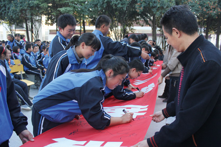 10月31日,县实验中学举行“三城联创”师生承诺签名和志愿者服务队授旗仪式活动,并为60余名“三城联创”志愿者授旗,倡导广大师生树立主人翁意识,讲文明话、重卫生习惯、遵守公共秩序以实际行动为“三城联创”作出自己应有的贡献。 (刘臣 曹刚 摄)