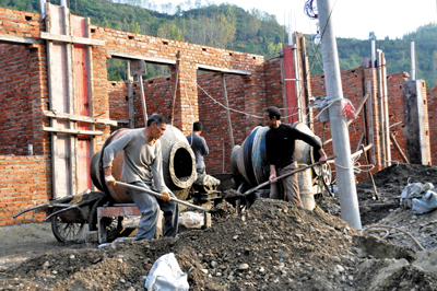 今夏,我县部分乡镇遭受“8.5”特大洪灾,县扶贫办等有关单位积极向上争取救灾资金,把扶贫搬迁与倒房重建、危房改造、生态移民、竹房城镇带建设有机结合,将505户贫困户列入扶贫搬迁对象,重点建设集中安置小区12个,带动全县扶贫搬迁、移民搬迁、工程搬迁工作全面开展,截至10月31日,扶贫搬迁建房已竣工195户,有310户已完成70%工程。图为红塔镇双溪村一组村民王国华正在加紧建房的场景。 (张仁华 龚娟 摄)