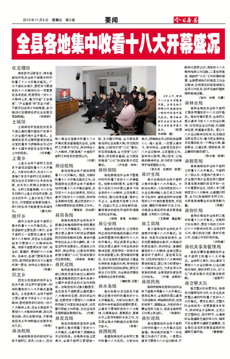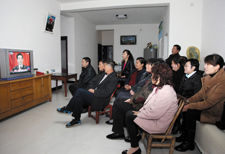 8日上午,党的十八大在北京隆重开幕。全县各地干部群众怀着激动的心情收听收看开幕式盛况。图为城关镇东关社区杨光林家正在收看开幕式盛况。 (赵爱平 胡翠 摄)