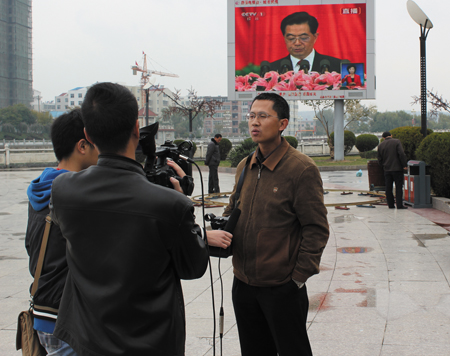 8日,中国共产党第十八次全国代表大会隆重召开,又恰逢第十三个记者节。我县《今日房县》报、《今日房县》网、房县电视台的记者们为了做好十八大宣传报道工作,仍忙碌在第一线,用镜头记录下社会各界收听观看十八大开幕盛况。图为记者们正在现场采访。(闻燃 陈锐 摄)